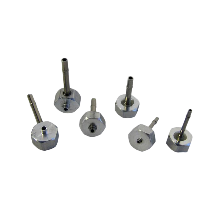 These pressure taps provide users with a convenient solution for mounting tubulations to models or test articles. A small hole can be drilled on the test article and the pressure tap can be fixed to the article using adhesive. The through hole design of the tap will allow for a flush finish on the exterior of the test article. These pressure taps are available in .040″ and .063″ tubulations, straight or 90 degree orientation, and various “stickout” lengths.